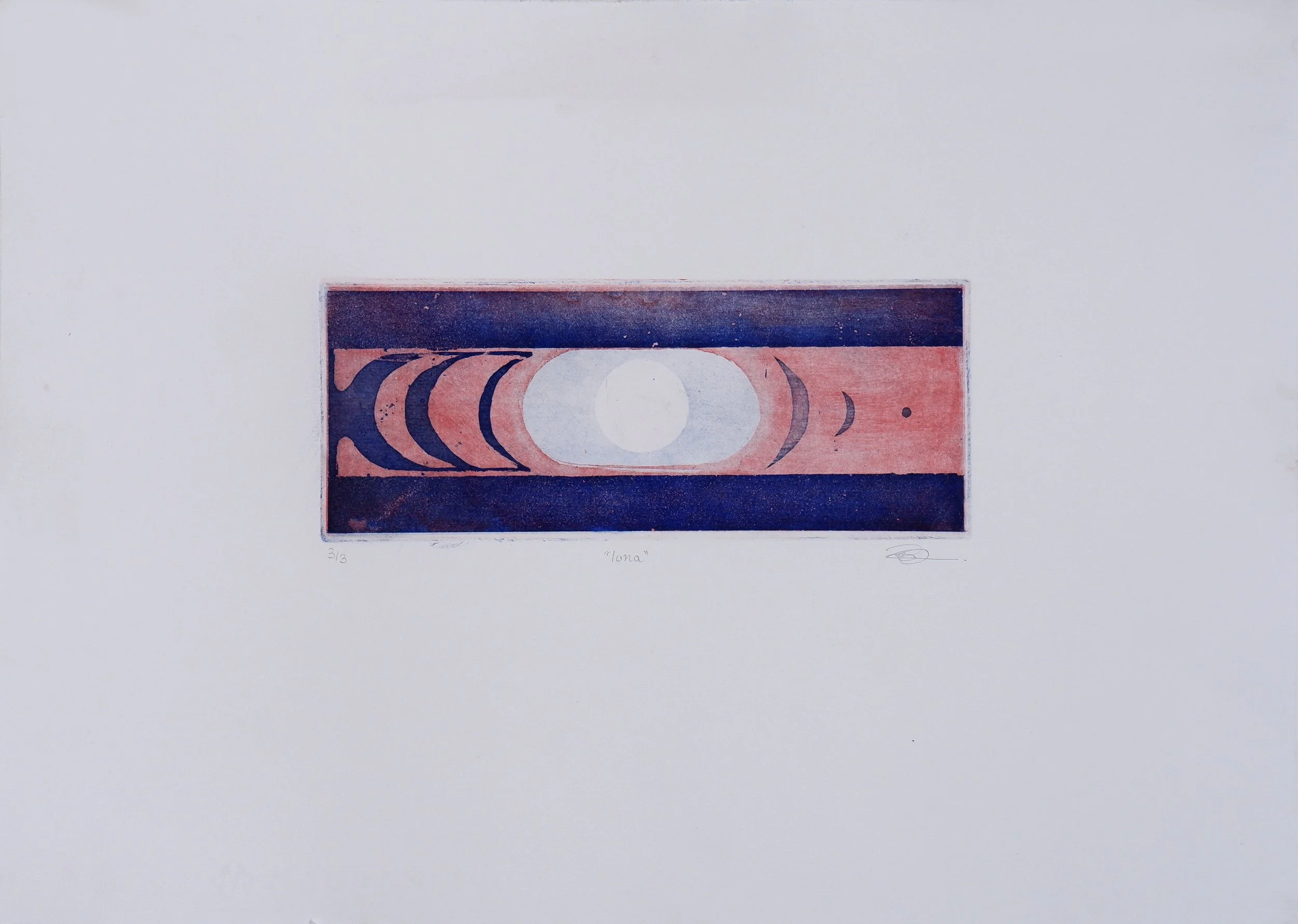 Luna reflects our perception of the moon’s movement across the sky, from dusk to dawn. Clulow aimed to capture this shifting presence using overlapping geometric shapes with varied tones, creating a sense of motion and transition. Luna is an abstract, personal interpretation of the celestial body. In the creation of Luna only aquatint was applied to three zinc plates, varying acid exposure times to achieve tonal differences within the print.