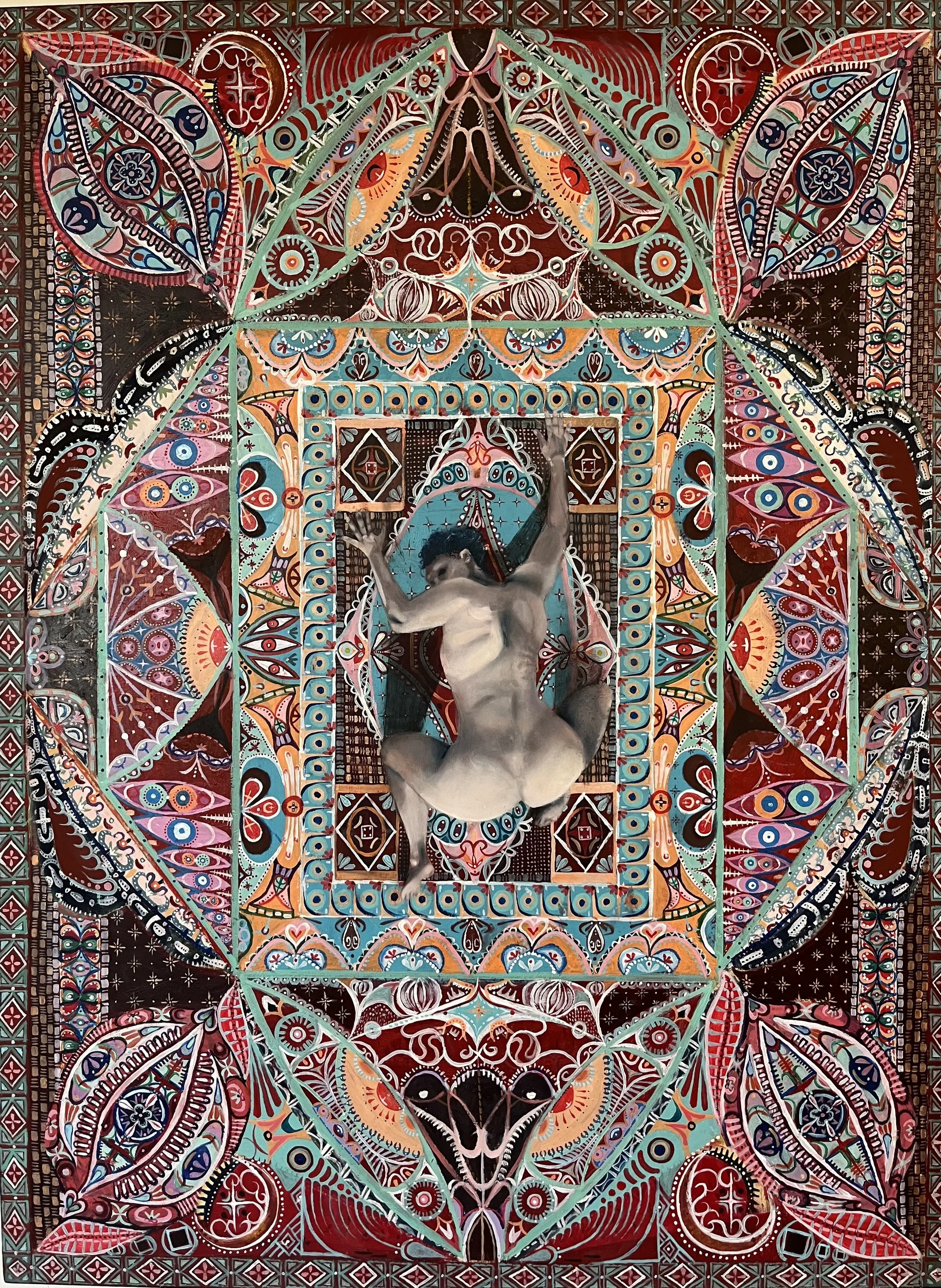 This duo marked the first exploration of ornamentalism in Clulow’s work, offering a free and more creative approach compared to their current process. Both pieces feature carpet-like backgrounds with nude figures atop a kaleidoscope of colors. The drained, lifeless pigmentation of their skin contrasts sharply with the vibrant environment. The compositions are largely flat, with no horizon line or fixed dimension; the only suggestion of space comes from the shadows cast beneath the figures. These works were a way to explore the subconscious, the freedom of the patterns reflecting the artists mental state at the time. This psychological exploration brought forth a realization of themes highlighting sexuality, as well as societal and patriarchal expectations. These figures served as the first self-portraits in Clulow’s work, marking the beginning of the deeply personal themes that would follow. Bleed me was created entirely in oil paint, while Until I’m dry combines oil and acrylic. The process behind the works creation involved the construction of a basic composition using shapes and colours, followed by multiple layers of painted patterns, sometimes overlapping. Until I’m dry includes several under-paintings, around three carpet layers beneath the final version.