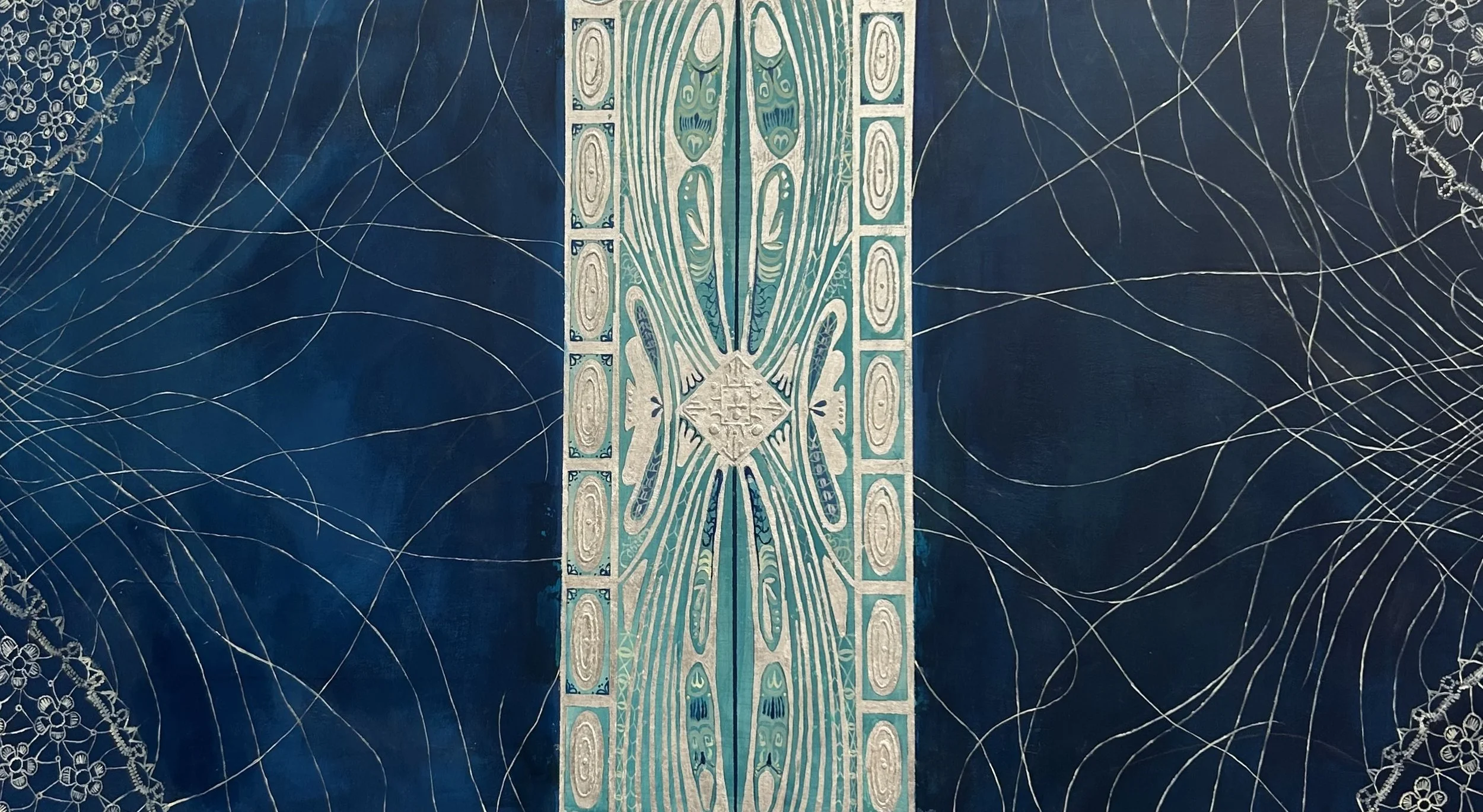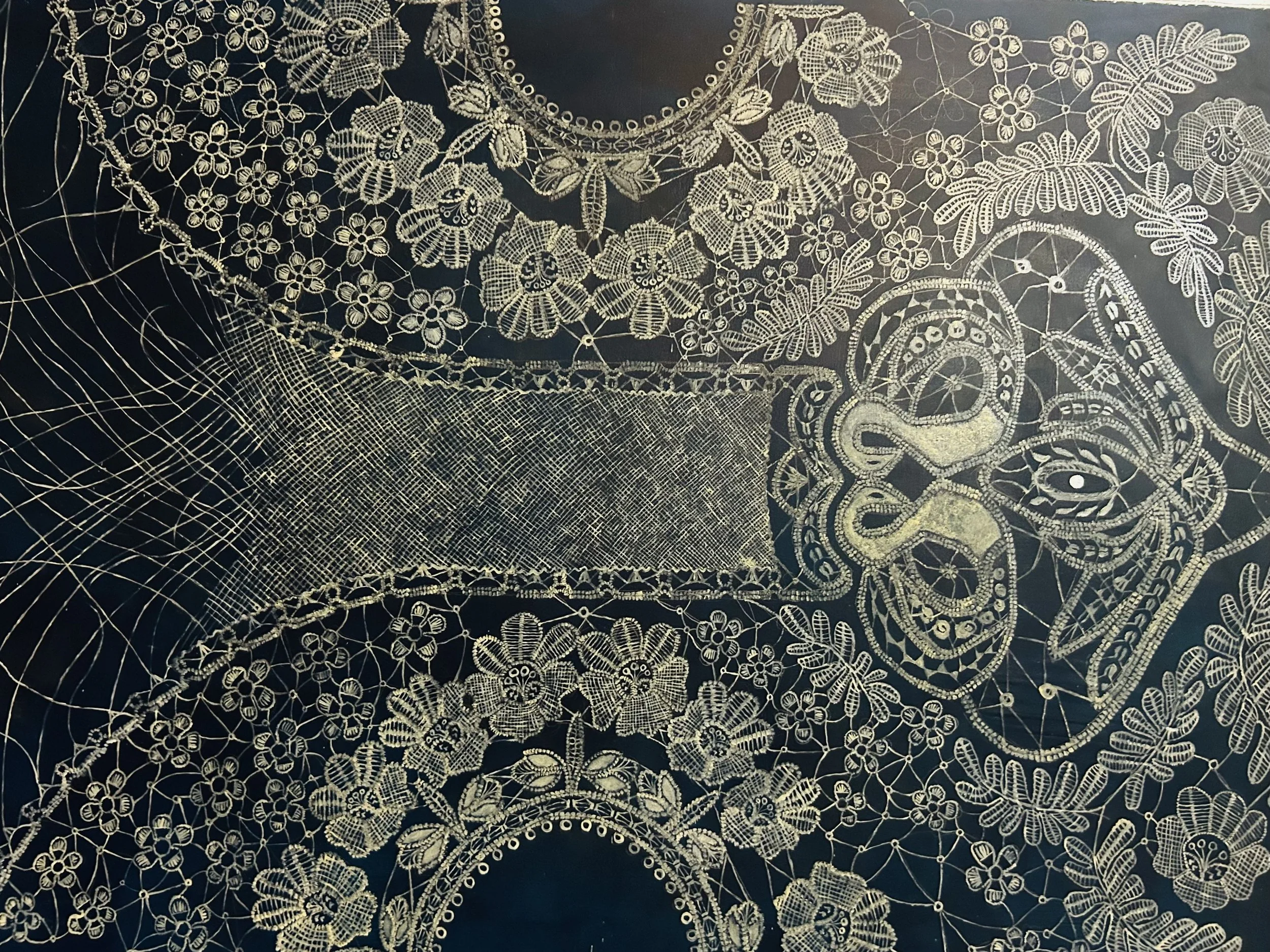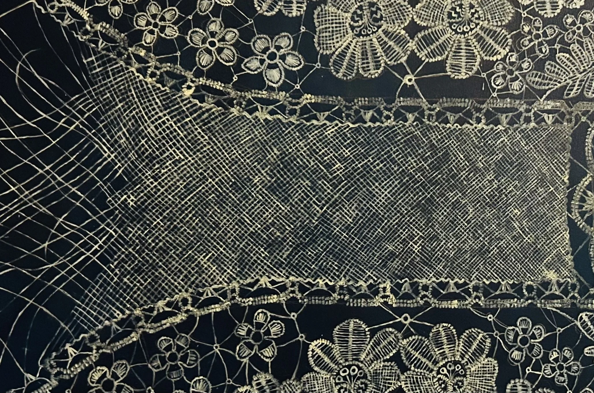 The technical process reinforcing the work involved the construction of low-relief forms beneath the silver leaf, using a traditional gesso made from boiled-down rabbit-skin glue. The material and conceptual qualities of lace served as a major point of reference throughout the development of The Last Straw. The intricate, laborious nature of lace-making, its fragility, precision, and historical resonance, offered a compelling framework for exploration within the oil medium. Reproducing the fineness of lace through paint was a critical component in articulating the work’s thematic concerns around tension, transformation, and continuity.