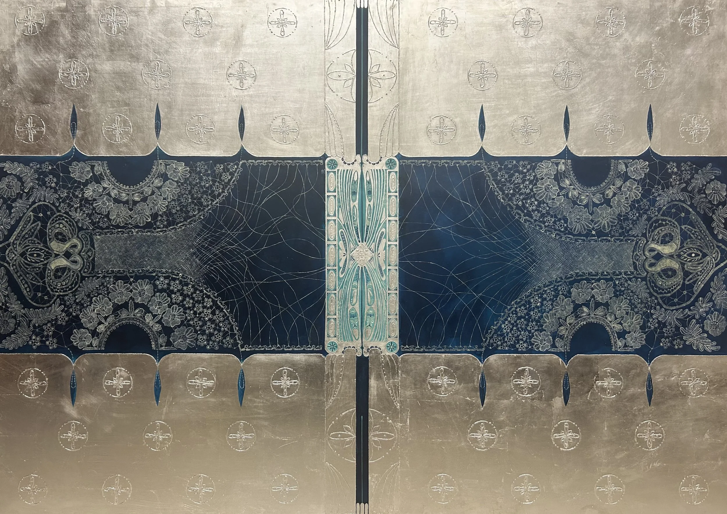 The Last Straw presents a visual meditation on the tension between desperation and reformation, contingent on the viewer’s perspective. Central to the composition are two lace motifs, which appear either to be in the process of disintegration or reconstitution. This ambiguity is deliberate, inviting multiple readings. The mirrored forms establish a sense of duality and introspection, reinforced by the symmetrical layout and the reflective quality of the silver leaf.