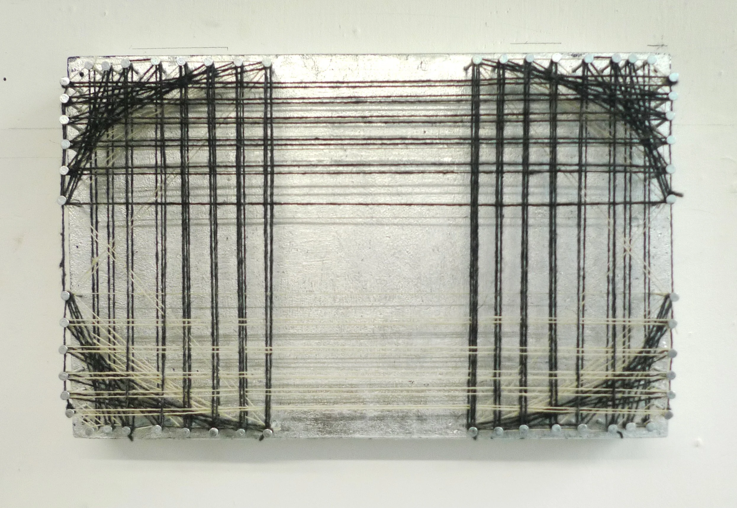 imitation silver Leaf, steel nails, linen and wool thread on wood plank