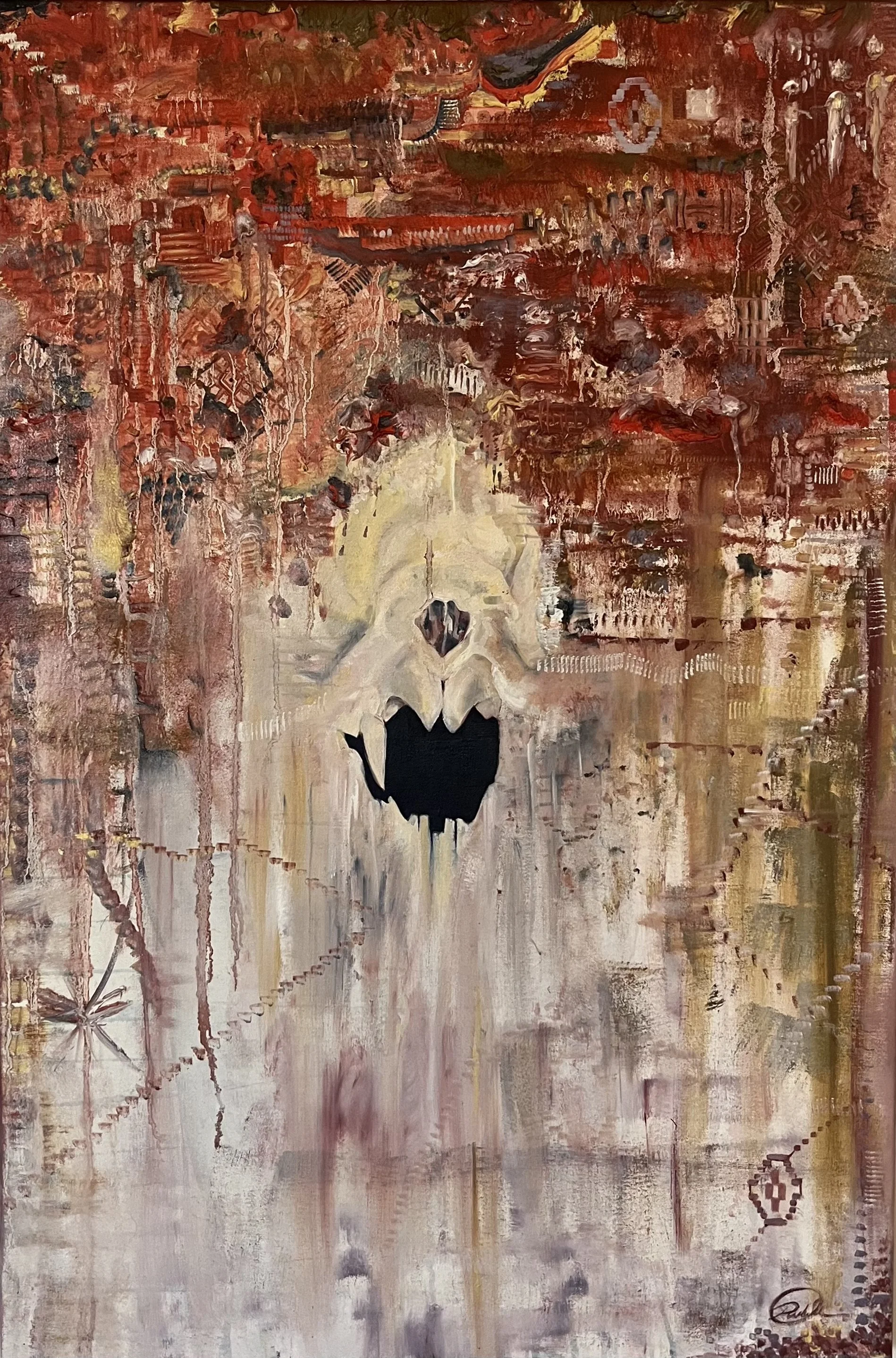 Vampyr is a chaotic departure from Clulow’s usual precise style, with thick layers of oil paint in dark red, ochre, violet, white, and Naples yellow, blending down the canvas. In its centre is a depiction of a vampire bat skull. The various symbols amongst the composition are traditional Romanian patterns and sigils. Many of them represent different emotional intentions ie. the diamond represents peace within oneself and others, while the diamond with extended lines represents the all seeing eye (wisdom, a higher power etc.) Vampyr like most of the artist’s work was inspired by textiles, the textures within them, and their contents, much of this piece is an imitation of fibres and stitching on a 2 dimensional surface. The bat skull at the painting's centre is a reference to the history and myth behind Romanian folklore most obvious being the tale of Dracula. It also served as a new exploration of a different subject in figurative painting, that being bones.